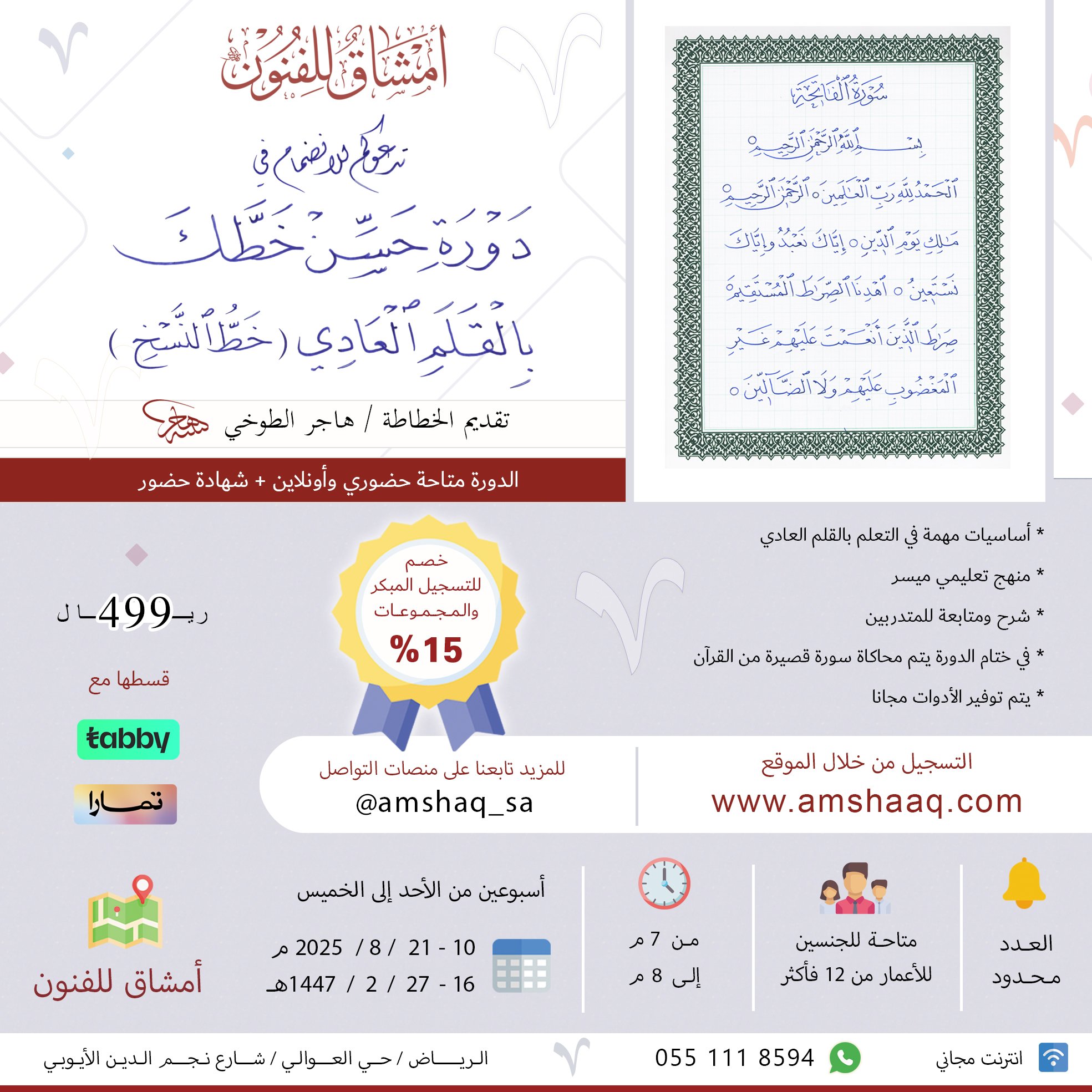 يسرنا في #أمشاق_للفنون دعوتكم للانضمام معنا فيدورة حسّن خطكبالقلم العادي ( خط النسخ )دورة حضورية واونلاينمع الخطاطةأ / هاجر الطوخي@hager_e...